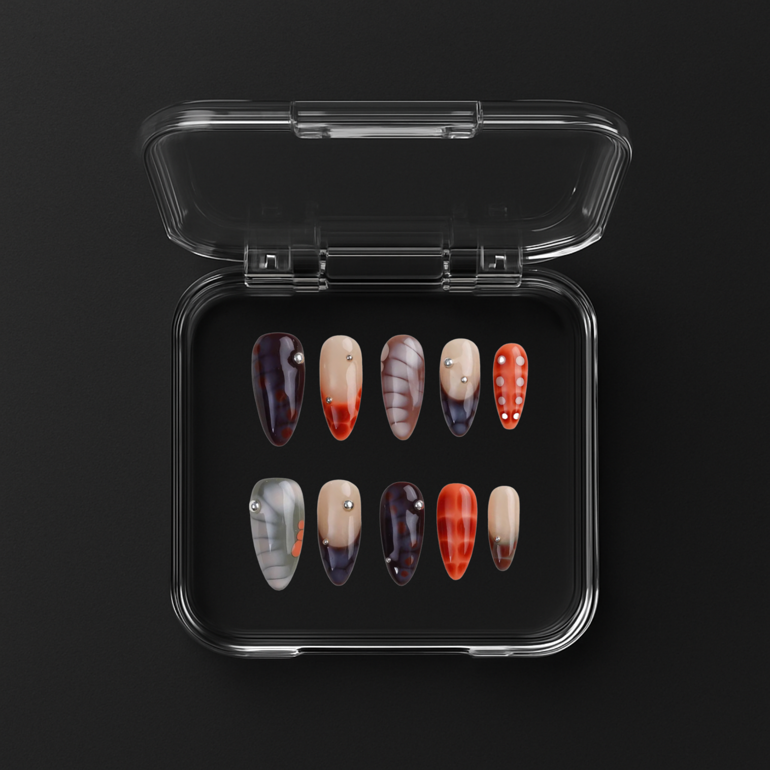 KURU press-on nagai – maži, stilingi ir funkcionalūs. Rankų darbo geliniai nagai tvirtai priglunda ir yra atsparūs kasdieniam nešiojimui. Tinka visiems nagų tipams, suteikia salono lygio rezultatą be salono vizito – užsidėsi namuose vos per 10 min.